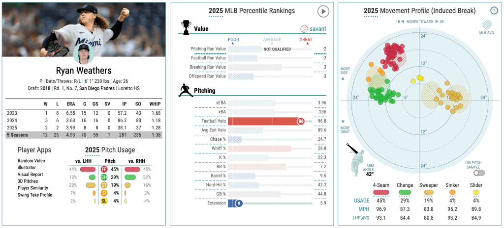 Weathers, 26, has a lot of upside and potential. During the 2025 season, he posted a respectable 3.99 ERA and a 1.28 WHIP over eight starts. While he has dealt with health-related interruptions in the past, his 2024 campaign (3.63 ERA in 16 starts) proved that he can be a highly effective mid-rotation starter when active.
