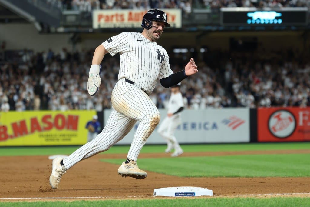 Oct 7, 2025; Bronx, New York, USA; New York Yankees catcher Austin Wells (28) rounds third base during the eighth inning of game three of the ALDS round of the 2025 MLB playoffs against the Toronto Blue Jays at Yankee Stadium. Mandatory Credit: Vincent Carchietta-Imagn Images